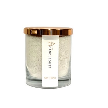 Sviečka Candledust v skle sa nachádza v priehľadnej sklenenej nádobe (rozmery 8x9 cm). Vo vnútri je namontovaný knôt a sviečka je zakrytá kovovým vrchnákom z ružového zlata.