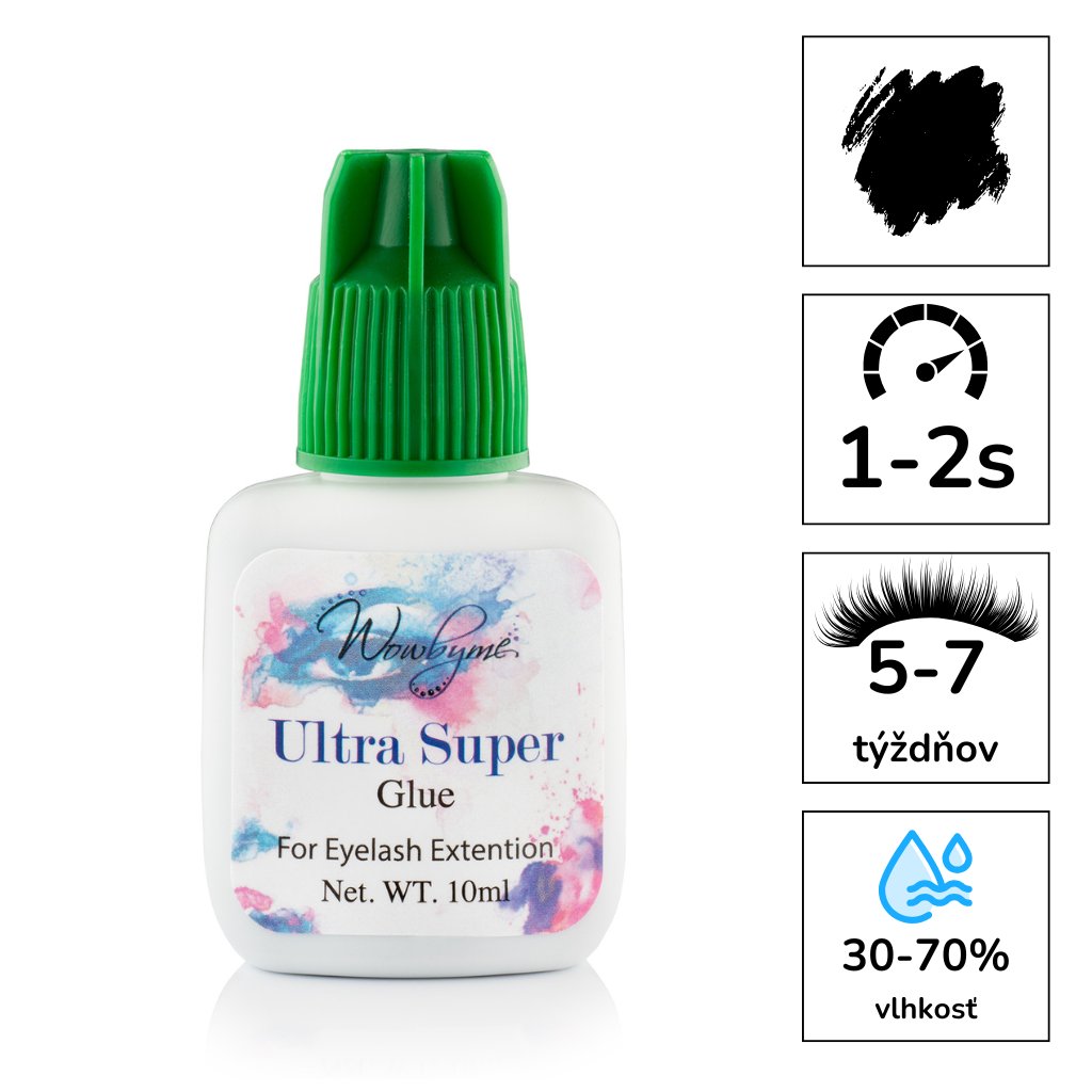 Ultra Super lepidlo WOWBYME je velmi oblíbené mezi profesionály díky jeho výborným vlastnostem, které zaručují rychlé schnutí, dlouhou trvanlivost po aplikaci, nepálí v očích. Lepidlo Ultra super je spolehlivé a profesionální lepidlo s retencí 1-2 sekundy.